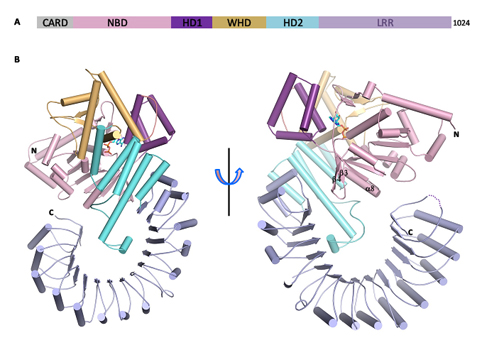 该研究通过结构生物学和生化实验揭示了NLRC4维持自抑制的机制,同时也是该家族中第一个被解析的近全长的蛋白晶体结构,该结构基础对于研究相关疾病发生的分子机理具有重要的意义。
