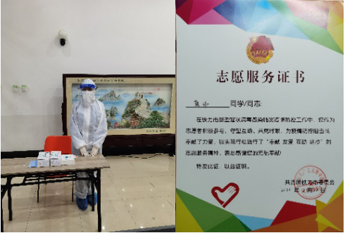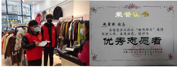 赵鑫然同学的家乡在当时疫情十分严重的河北。放假回到家后,他立马投入到社区疫情防控中。他牺牲春节假期,积极响应号召,自愿投身到社区服务岗为疫情防控工作贡献自己的力量。“面对疫情,社区工作人员不顾自身安危,日夜奋战在防疫一线,我是新时代的青年人,我也应为社区贡献一份力量。”,赵鑫然如是说。