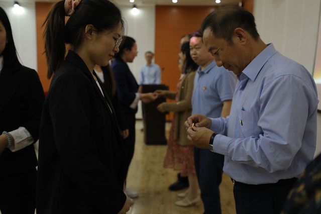 老党员为新党员佩戴党徽仪式