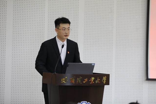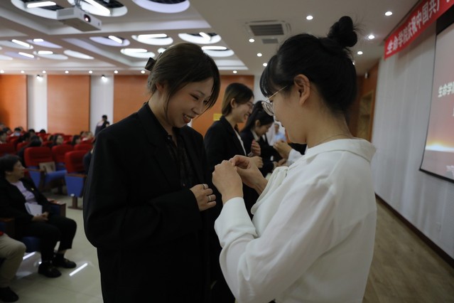 随后举行了老党员为新党员佩戴党徽仪式,以这种以老带新、薪火相传的方式,四十名新党员光荣地佩戴上了第一枚党徽。接下来党委副书记张勇领誓,新老党员同志们一起高举右拳,面对鲜红的党旗,新党员庄严宣誓,老党员重温入党誓词。一字一句,铿锵有力,加深了每一位党员心中的责任感与使命感。秦建华同志代表新党员发言,他表示,作为新时期的共产党员,要肩负历史使命,坚定前进信心,立大志、明大德、成大才、担大任,努力成为堪当民族复兴重任的时代新人,要不断自我学习、自我提高、自我完善,提高政治思想素质,坚定共产主义信仰,发挥先锋模范作用,永葆共产党员的先进性,以党性来约束、激励自己,带动身边同学,将自身发展融入党的伟大征程中。