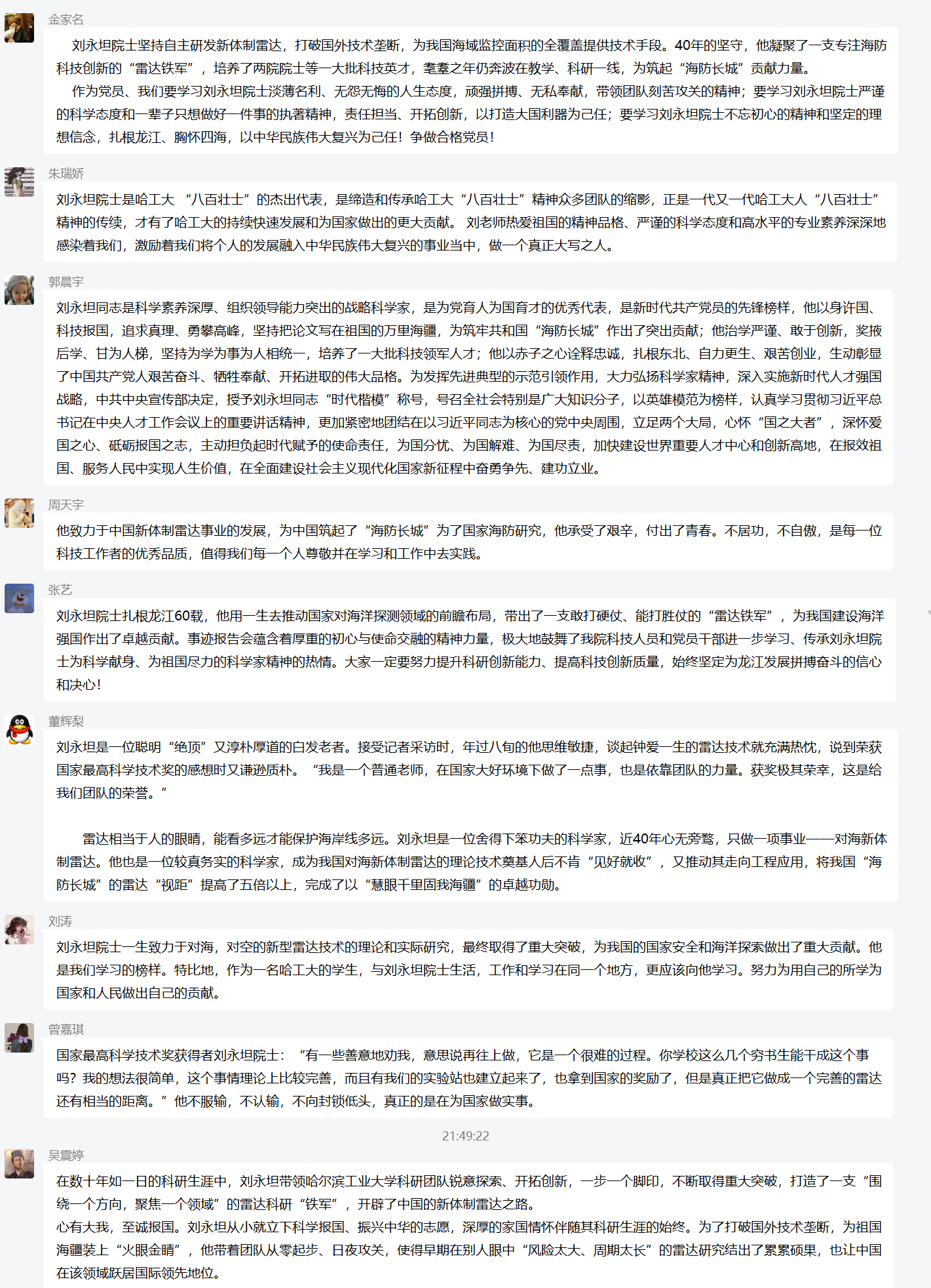 生命学院研究生会主席团成员,20级硕士生张琛:刘永坦院士治学严谨,教学有方,带领团队建成具有全天时全天候远距离探测功能的对海新体制雷达,培育凝聚了一支掌握海防科技主动权的战略创新力量,铸就了捍卫国家领土主权的海防重器。作为哈工大学子,我感到深深的骄傲与自豪,我将以刘永坦院士为榜样,在自己的领域中攻坚克难,不畏艰险,磨练意志,铸就品格,为国家和社会贡献自己的一份力量。