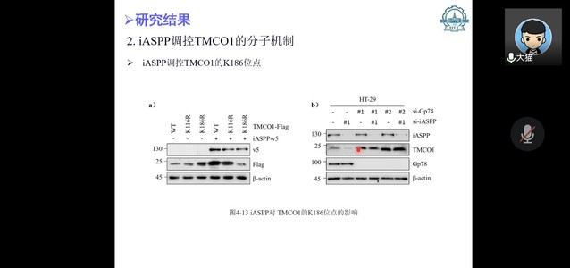 郑善亮详细介绍了癌基因iASPP能够以TMCO1依赖的方式维持低水平内质网Ca2+,并进一步阐述了iASPP调控TMCO1蛋白表达的分子机制,即iASPP92-294)与TMCO190-188)竞争地结合Gp78(301-400),从而增加了TMCO1的稳定性,进而维持内质网中Ca2+稳态,以此促进肿瘤的生长。