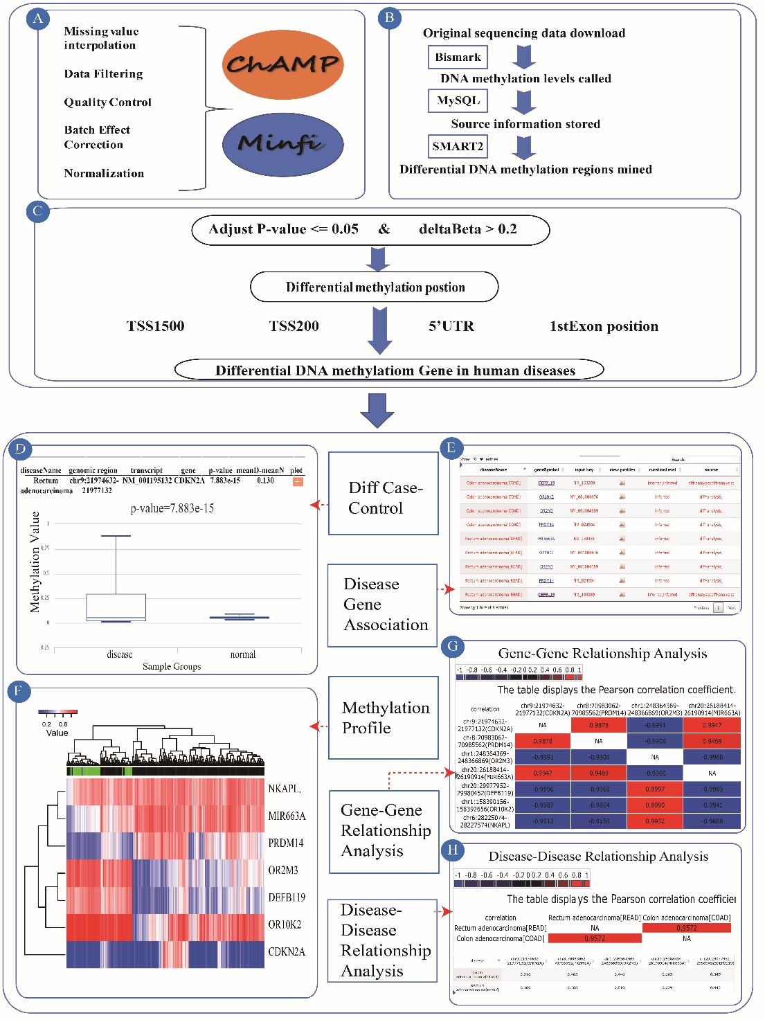 在这项研究中,整合了目前所有人类 DNA 甲基化疾病公开可用的元数据,构建了一个集存储、查询、分析、可视化、下载等功能的综合性DNA甲基化疾病数据资源交互平台——DiseaseMeth version 3.0。数据库中包含162种与DNA甲基化相关的疾病数据,49,949个高通量测序数据的样本,以及3328个从文献中手动挖掘的经实验验证的DNA甲基化疾病关联基因。针对这些DNA 甲基化数据集的元数据建立了统一的、标准化的分析流程,并提供基于不同实验技术平台(如450K、WGBS等)检测的疾病DNA甲基化谱和进一步挖掘分析信息,涵盖了多种统计结果,包括差异分析、相关分析、生存分析和网络分析(图1)。