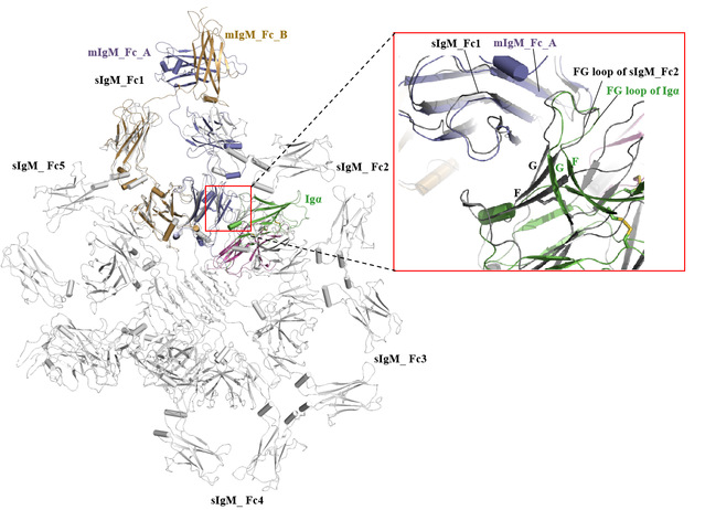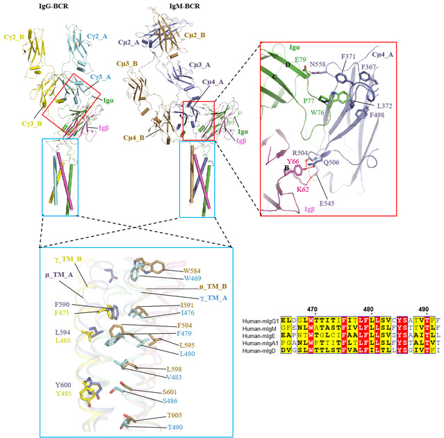 人类B细胞受体有5种亚型,在该研究中,该课题组解析了人IgG和IgM两种亚型的BCR复合物结构,BCR复合物结构包含了一个膜结合形式的免疫球蛋白(mIg)同源二聚体,用于识别抗原,以及一个膜结合形式的Igα/β(CD79α/CD79β)异二聚体,用于信号传递(化学计量比为1:1)。其中,mIg二聚体包含了Fab和Fc结构域、连接肽(CPs)和跨膜(TM)螺旋,Igα/β结构由两个胞外Ig样结构域、CPs和TM螺旋组成。IgG和IgM-BCR复合物的组装分别由胞外的IgG-Cγ3和IgM-Cμ4与Igα/β的Ig样结构域,以及连接肽、跨膜螺旋承担。课题组通过两个亚型的结构比较发现,mIgG和mIgM的跨膜螺旋区通过保守的疏水和极性作用与Igα/β 结合。相比之下,在胞外区域,IgG-Cγ3和IgM-Cμ4分别通过“首尾相连”(head-to-tail)以及“肩并肩”(side-by-side)的模式与Igα/β的Ig样结构域结合,其中,Igα的CD loop 旋转了90度,分别与Cγ3和Cμ4结构域结合。结构上观察的不同亚型组装模式是否和活性有关值得进一步研究。