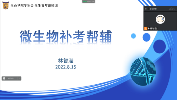 为帮助同学们在暑假期间提高学习效率,合理安排秋季学期补考复习计划,巩固学科专业课程,端正学习态度,2022年8月6日到8月15日,beat365在线唯一官网登录生生青年讲师团通过腾讯会议成功组织了考前帮辅活动,本次考前辅导活动由生生青年讲师团王梓伊老师指导,林智滢同学组织,龚治金、肖贺、田凤仪、林智滢同学担任讲师,对马克思主义基本原理、分子生物学、生物化学和微生物学课程进行讲解