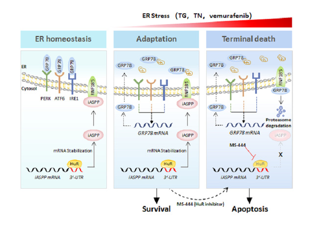 图一:iASPP/GRP78调控终末期UPR影响内质网应激诱导的细胞凋亡示意图