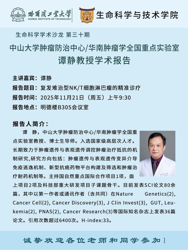 【生命科学学术沙龙第三十期】中山大学肿瘤防治中心/华南肿瘤学全国重点实验室谭静教授学术报告