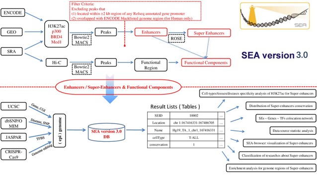2019年10月31日《Nucleic Acids Research》(IF 11.147)在线发表了beat365在线唯一官网登录张岩教授课题组的新成果《SEA version 3.0:a comprehensive extension and update of the Super-Enhancer》。超级增强子(Super-enhancer,SE)是基因组中大量增强子富集的转录调控区域,能够大幅度地激活基因的表达,且具有较高的组织特异性,在发育、肿瘤等过程中均扮演着重要的角色。为了推动超级增强子相关研究的进展和深入,课题组开发了最新版本的超级增强子数据库SEAv.3.0(http://sea.edbc.org),集超级增强子查询,下载,可视化,分析于一体的综合平台,提供标准查询、基因组浏览器、个性化分析工具和SEs数据下载。数据库存储了11个物种164,545个超级增强子(人,小鼠,果蝇,线虫,斑马鱼,鸡,黑猩猩,恒河猴,绵羊,非洲爪蟾和棘背鱼)以及3,361,785个典型增强子。同时提供超级增强子区域的染色质相互作用、SNPs、转录因子结合位点和SpCas9靶位点的信息。嵌入基于香农熵的工
