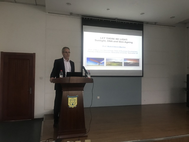9月28日上午,应beat365官网国际项目管理中心和生命学院邀请,纽卡斯尔大学细胞医学研究所MarkBirch-Machin教授来访beat365官网,并做题为“Lettherebelight:SunlightDNAandSkinAgeing”的报告,本次报告由生命学院胡颖教授主持。MarkBirch-Machin教授围绕着人体皮肤因紫外线辐射引发的皮肤老化和癌症发生的相关研究做了详细的介绍。其中特别涉及了线粒体损伤的发生。线粒体呼吸链是细胞氧化应激的主要产生者,被认为是包括皮肤在内的许多组织中癌变和衰老的潜在因素。在之前的研究中关于呼吸链(RC)复合物I,II和III对活性氧(ROS)产生的作用的研究主要集中在大鼠组织上,而在该教授的的研究中,研究团队使用一系列已建立的特异性代谢抑制剂和DHR123荧光来研究线粒体RC复合物在2种人类皮肤细胞中影响ROS产生的相对作用。进而探究人体皮肤因紫外线辐射引发的皮肤老化和癌症发生的相关分子机制的改变。报告结束后,MarkBirch-Machin教授与师生就感兴趣的问题进行了分享答疑。