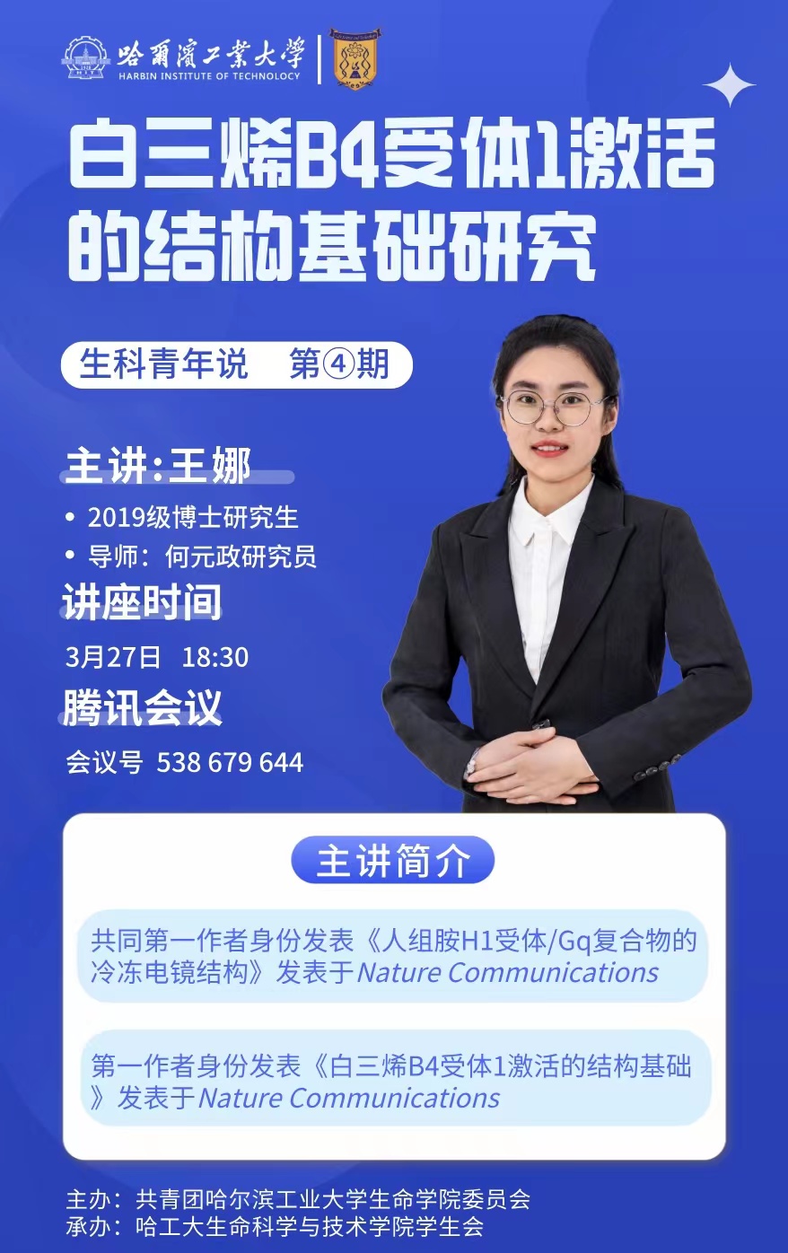白三烯是在炎症过程中起重要作用的花生四烯酸代谢途径的产物,是很强的炎症因子,在哮喘、高血压等病理过程中起重要作用,白三烯受体1和白三烯受体2介导这个过程,因此解析白三烯受体1的结构对于设计针对该受体的药物至关重要。为聚焦生命学科前沿,在生命学院团委的支持下,生科青年说第4期将邀请生命科学中心从事G蛋白偶联受体信号传导机制研究的博士生王娜,为大家介绍白三烯受体1激活结构基础的最新研究进展。一、讲座信息:主讲人:王娜讲座时间:2022年3月27日18:30讲座平台:腾讯会议会议ID:538 678 644二、主讲简介:王娜,2019年加入生命科学中心何元政研究院课题组,从事G蛋白偶联受体信号传导机制研究。以第一作者身份发表《白三烯B4受体1激活的结构基础》于“Nature Communications”,共同第一作者身份发表《人组胺H1受体/Gq复合物的冷冻电镜结构》于“Nature Communications”。